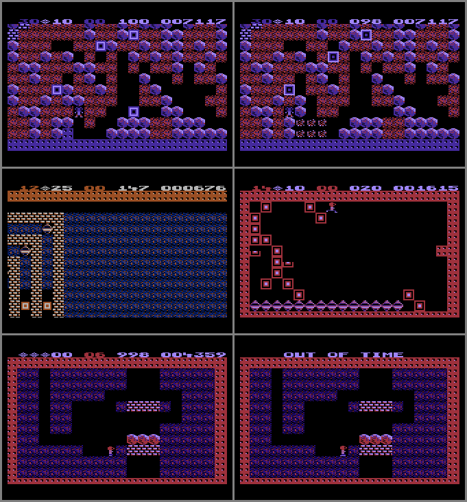 • BUG: The timing in the PAL version is noticeably different from the NTSC version. As a result, the screen doesn’t scroll as fast as Rockford can run, making it possible to run off-screen before reaching a border (picture #3). A more serious issue occurs on the 3rd bonus life challenge. The delay in Rockford’s appearance is serious enough that the level is not solvable - he enters the cave at the same time the fireflies reach it (picture #4), resulting in immediate death.