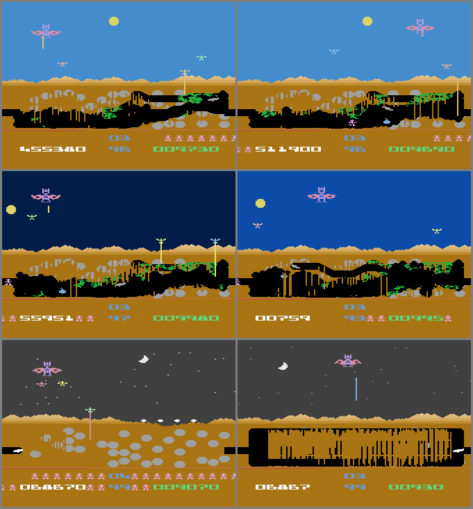 • BUG: Doing the 255 extra lives trick helps to expose several other glitches. Eventually the whole lower area will be filled with reserve icons (picture #5), either as a result of earning or losing too many icons. Also, it’s not possible to lose the maximum 255 lives per quadrant; the limit is close to 250, at which point you’ll automatically advance to the next quadrant. Through a combination of either being on a given (or specific) quadrant too long, or one too many byte rollovers, the smaller birds will disappear (picture #6), but return if you advance to the next quadrant. {Scott Stilphen}