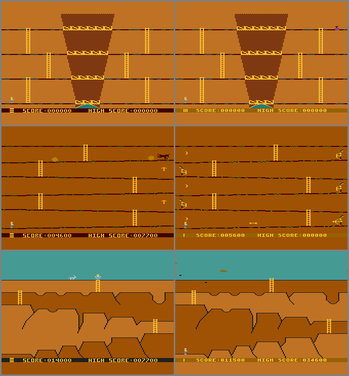 • A prototype version exists (pictures #1, #3, and #5) that has several differences from the released version (pictures #2, #4, and #6). It has a custom font but lacks any title screen or copyright info (picture #1). The theme music plays faster and pressing RESET doesn’t start/restart a game. Also, the reserve lives indicators are horizontal instead of vertical (picture #2). On the 1st screen, there’s no plunger for the dynamite, but if you run to the upper-right corner where it should be, the bridges will blow up. On the 2nd screen, the natives and arrows (picture #4) are missing, and in their place is a donkey that kicks boulders down the ramps from the upper-right corner (picture #3). The shields are also gone and instead there are pickaxes to break the boulders. When you complete this screen, the theme music plays before you start the 3rd screen. Your character doesn’t jump straight up as it does in the released version. On the 3rd screen, the colors of the canyon walls are swapped (pictures #5 and #6). You can safely stand on either the left or right edge of the screen and you won’t get hit. When you reach the top, the theme music again plays while your character dances, and when it finishes, you stop dancing and the goat comes out to knock you down.