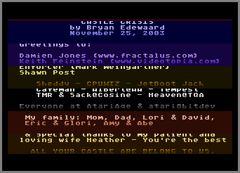 • HIDDEN MESSAGE: Hidden in the code is a message from Bryan Edewaard: "Hello, and welcome to the Castle Crisis ROM image. I've got a little bit of free space here at the end of bank 1 so here's some info about the game. This project started over 2 years ago because I wanted a portable way to play the awesome Warlords arcade game. I had a 2 player upright machine that I'd converted to 4 player (using modified Atari paddles) and it was a major hit with my friends. This may be why I prefer the upright color scheme - the cocktail just looks too weird. Anyway, my original goal was to have a 16K A8 cartridge that required 16K of RAM. This eventually grew into the 32K bank switched cartridge that was released. There was just no way to keep it fast and shrink the code enough (6502 code can be very compact, but unrolled stuff is much faster). Another goal was to represent the castles properly as 10x10 character blocks in a 32x30 environment. Since the Antic has no modes even close to this, the castles are managed in 5x7 pixel blocks. This keeps them from having that "stretched-to-fit" look that so many A8 games have. My friends and I have been play-testing it, and I think it preserves the arcade feel quite nicely (for instance, Castle Crisis seems to inspire just as much trash-talk in 4-player mode as Warlords). BTW... press SELECT for extended deathmatch modes, and hold all 4 paddle buttons at start-up for the hidden greetings screen. Game LEDs are supported as well (like those inside the arcade buttons). Pins 1&2 of each game port are pulled low to illuminate a player's LED. Also, the 1200XL's panel LEDs are used. Anyway, the 5200 version is next and will support those wonderful 5200 sticks (ack!) or paddle controllers. -Bry Dec 1, 2003".