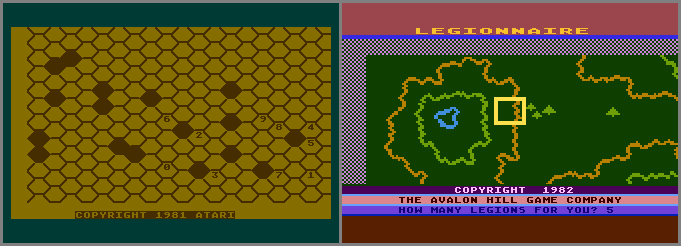 • 2 versions exist. Centurion is actually a port (by Rob Zdybel – picture #1) of Chris Crawford’s original version of Legionnaire, which was done on a Commodore PET. After the success of Eastern Front (under APEX/Atari), Avalon Hill wanted a similar game, and E.F. was reworked into a new version of Legionnaire (picture #2).