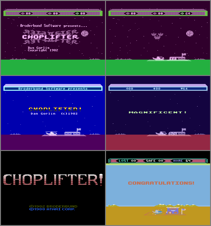 • If you rescue the maximum hostages (64) on the Brøderbund Software disk version, their logo appears (picture #2); if you do the same with the Brøderbund Software cart version, “Magnificent!” appears (picture #4); on the Atari version, “Congratulations” appears (picture #6).