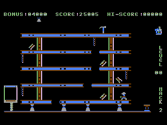 • Pirate copies exist (such as one from “nyte byte”) that have been hacked to make the game easier. With the original version, on the 2nd screen, the machine in the lower-left corner immediately starts dropping stuff, but with the pirate version, it doesn't start running for a few seconds, giving you time to safely jump on the belt.