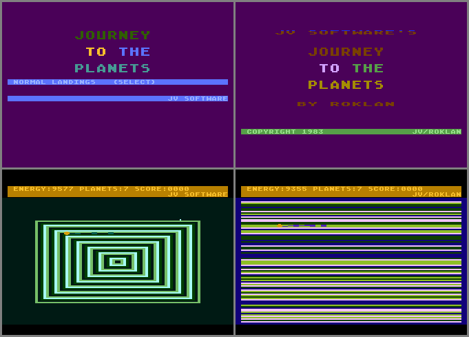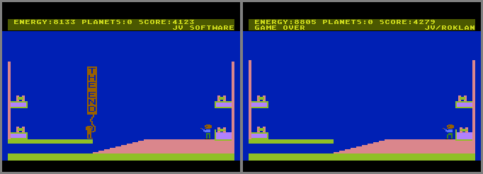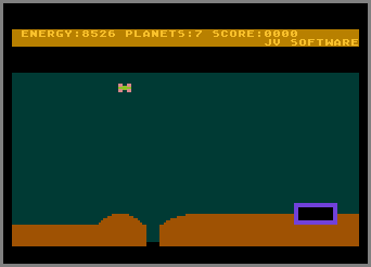 • 2 versions exist! The original was released by JV Software (on disk?) and says “JV Software” on the screen (pictures #1, 3, #5, and #7). The game was later released on cart by Roklan and says “JV/ROKLAN” (pictures #2, #4, #6). The other differences between them are the title screens (pictures #1 and #2), landing options (original version has “normal” and “hard” landings; the re-release doesn’t have options, death screens (pictures #3 and #4), and ending screens (pictures #5 and #6). Also, the original version has a reverse gravity option, clouds in the landing/takeoff screens that throw you off course when you touch them, planet re-entry screens that show miniature renderings of the full planet surface (picture #7), and a much more difficult landing on the final planet (see below).