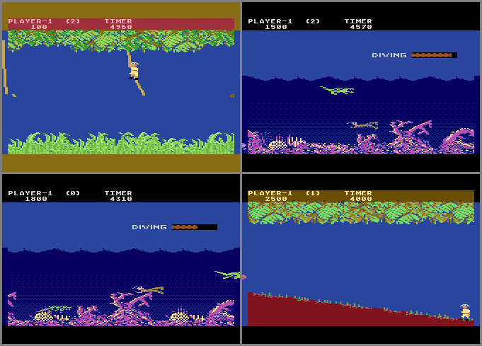 • BUG: Beat the 1st level. While your remaining time is being added to your score (during the congratulations screen) press START twice (to end the current game and then start a new one). Your time will still be added to your score, but it uses the current timer (which starts at 9990), giving you 15,000 points and an extra reserve life to start with (picture #3)! Also, the other “timer” that gives you a limited amount of time to stay on a rope won’t be in effect, so you can stay on any rope as long as you want. On the river section, the air meter will never go down – it must be tied in with the timer, which is still showing 0000. The timer gets reset once you hit the boulder section, but it starts at 9990 so you'll once again get mega bonus points when you beat the level, giving you approximately 50,000 for level 1!