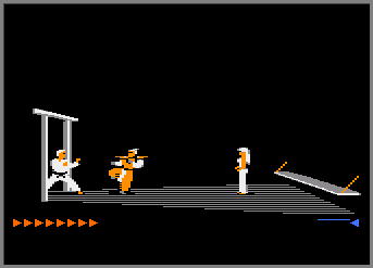 • BUG: If you kill a guard with the sound glitch in the 8-30-85 prototype version, parts of the contact explosion graphics may remain onscreen (video #9). If you move over them, they’ll disappear. {Scott Stilphen}
