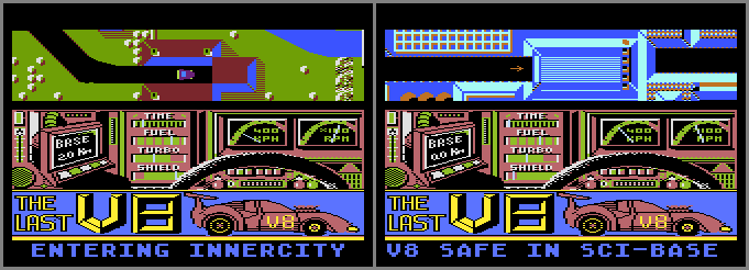 • There are only 2 parts to the game, which repeat indefinitely. In the first, you have to reach your base (picture #1); in the second, you have to reach the Sci-base (picture #2). The game is missing the very first part, which is in the Commodore C-128 version. It’s also missing the voice synthesis, which is in both the C-64 and C-128 versions.