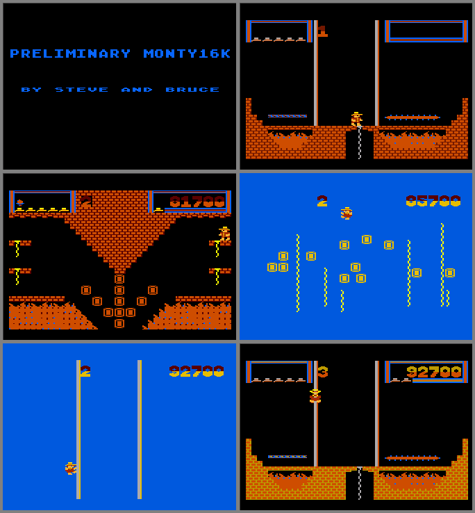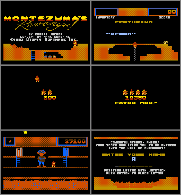 • 2 different versions exist! A prototype 48K version was done by Utopia Software and features an animated title screen (picture #1) & introduction (picture #2), as well as replacement and bonus life animations (pictures #3 and #4), King Montezuma himself (picture #5) and even a high-score entry screen (picture #6) - but no ending (it’s essentially an incomplete CES demo). Parker Brothers bought the rights and released a 16K version which lacks everything mentioned above, but includes a number of differences, such as a different name and hat for your character (picture #8), a continue feature, less rooms, no bats, and an ‘ending’ (pictures #9 - #12)! Bootleg copies sometimes referred to it as “Preliminary Monty” (picture #7). Note these copies (by pirates Steve and Bruce) are flawed in that they have 2 rooms on levels 1, 3, and 4 that are glitched (the left-most-screen on the 9th level down has some graphics issues and entering it will corrupt the inventory and score boxes, and the room below it on the 10th level is incorrect and features a rope at the top of the screen that goes nowhere). Also note the UK releases by Databyte (both disk and tape) contain the same bugs as the pirate version!