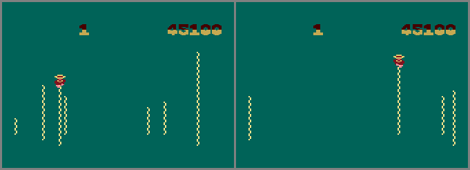 • BUG: The manual mentions if you miss a chain and land on a pole, you'll immediately lose any chance to collect more treasure. It also mentions you'll automatically advance to the next level when your time in the treasure room runs out. Both of these statements are incorrect. You can miss as many chains as possible in the allotted time you have in the treasure room. You can only advance once your time is up AND you either jump and miss a chain, or jump offscreen. {Scott Stilphen}