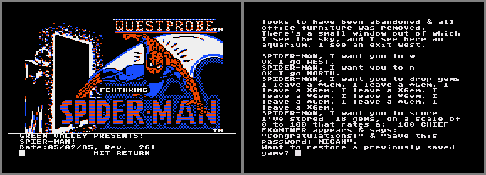 • "Micah" (Spider-Man), "Aria" (Hulk), and "Maegen" (Fantastic Four) are the names of programmer Scott Adam's kids. It was thought that the passwords were part of a Chief Examiner statement or riddle, since Micah (Synn) and Aria are also other Marvel characters, and because 12 games were planned for the Questprobe series (along with an accompanying Marvel comic book). Only 3 games/comics were made. The fourth comic starring the X-Men was already finished and was published years later in another series called Marvel Fanfare. Adventure International went out of business while game number four was being written (most likely X-Men).