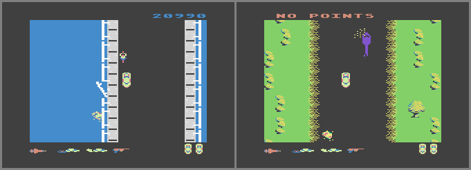 • BUG: Invincible trick – go RIGHT after leaving van into the margin. You can either “park” the car there (effectively pausing the game) or you can continue driving along the right edge forever (even over water) but you won’t get any points (video #1). A similar trick can be done in the arcade version.