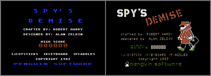 • HIDDEN MESSAGE: A secret encoded message appears on the screen after completing a level. Every completed level adds a new line of code, of which there are 9 total (picture #1). After completing 9 levels, the game ends. This was part of a contest by Penguin, and whoever solved it earned themselves a free Spy’s Demise T-shirt. From the manual: “If you think you have solved the puzzle, you will know what to do next. You’ll then be asked to submit a dossier consisting of your name, address, and the score achieved when the end of the puzzle was reached. For those who think that the secret may be found in the program code, sorry, you’ll be doomed.” DP’s own Kristine Roper solved the puzzle, which turned out to be a simple cryptograph: