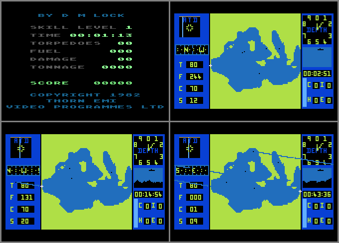 • EASTER EGG: Start a game (any skill level), select sonar mode ('S' key), and then hold down FIRE on joystick 3 and press the inverse key (to end the game). Instead of "GAME OVER", you'll see "BY D M LOCK" (for programmer Dean M. Lock – picture #1)! Note - this only works on the 400/800 (OS-B on emulators). {František Houra}