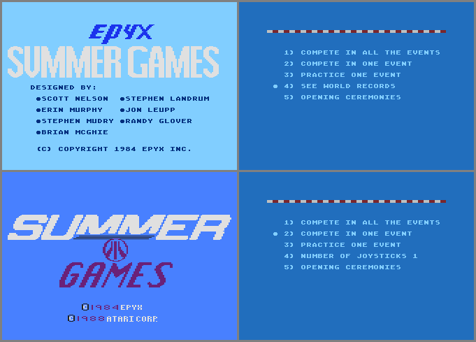 • 2 versions exist! Atari re-released it on cartridge, 4 years after the disk-based version was released. Besides having a different title screen (pictures #1 and #3), the cart only allows a max of 3 players (instead of 8). There’s also no option to record high scores or records (pictures #2 and #4).
