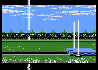 • BUG: It’s possible to clear the maximum height in the pole vault event (6.2) by passing under it! In the practice mode, set the bar to 6.2 and select a low pole grip. As soon as you plant the pole, push up. Then, when your knees are under the bar, press the fire button. If your timing is correct, you’ll miss the bar and fall far enough forward so that the vault will count as good. {CompuClub News, V2N1}. Once you clear 6.2, the meter counter will become garbled (picture #5). At 7.6, the graphics become garbled, making it impossible to continue. {Scott Stilphen}