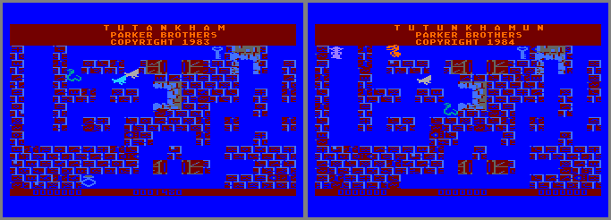 • 2 prototype versions exist – one dated 1983 (picture #2) and the other 1984 (picture #3). The 1983 version doesn’t show your character on the title screen, but it allows you to select which stage to start at (1-16); the 1984 version shows your character on the title screen, but doesn’t allow you to select a different stage to start at. The 1984 version has some bugs in it and is apparently earlier than the 1983 version. It also has the title spelled as “TUTUNKHAMUN”. There’s no Tutankham mask to be found (at the end of every 4th stage) in either version; instead, when you unlock the door, you’re shown another door!
