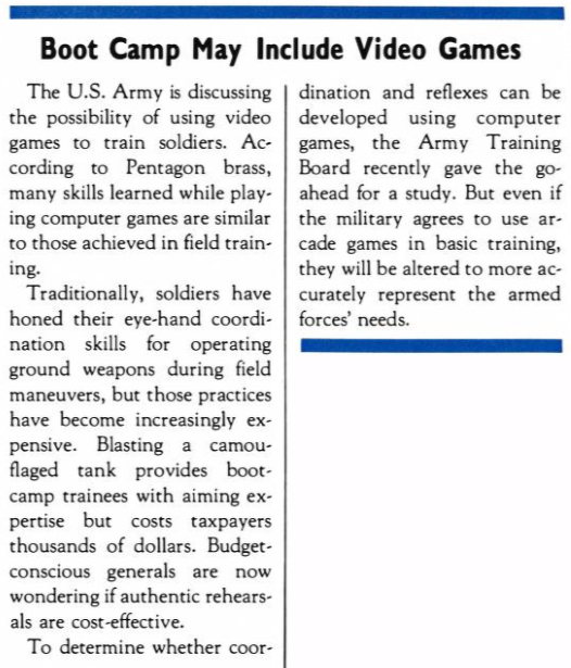 A special version was designed for the U.S. Army, commonly referred to as Army Battlezone. Only 2 were made. The first version is called the IFV (Infantry Fighting Vehicle) and was sent to Ft. Eustice, VA. It used a down-sized controller that was adapted from an actual Bradley. The second version is called the Bradley Trainer (or the Bradley Fighting Vehicle), and the controller was slightly redesigned, which was later used in Star Wars and a few other games (pictures #1-#6). The game is more a simulation, solely designed for the purpose of training tank gunners. The other tanks do not fire at you (although their turrets will *flash* to show they are), and the only way to end the game is to run out of ammo or shoot a 'friendly' tank or helicopter. A news blurb appeared in the December 1981 issue of Popular Computing (pg. 14) about the U.S. Army discussing the use of video games to train soldiers (picture #7). A small blurb about the game appeared in the first issue of Atari Age (picture #8).