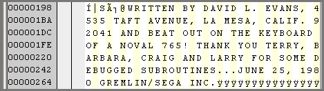 • HIDDEN MESSAGE: The message "WRITTEN BY DAVID L. EVANS, 4535 TAFT AVENUE, LA MESA, CALIF. 92041 AND BEAT OUT ON THE KEYBOARD OF A NOVAL 765! THANK YOU TERRY, BARBARA, CRAIG AND LARRY FOR SOME DEBUGGED SUBROUTINES... JUNE 25, 1980 GREMLIN/SEGA INC." can be found on ROM chip 691.u20 (see picture).