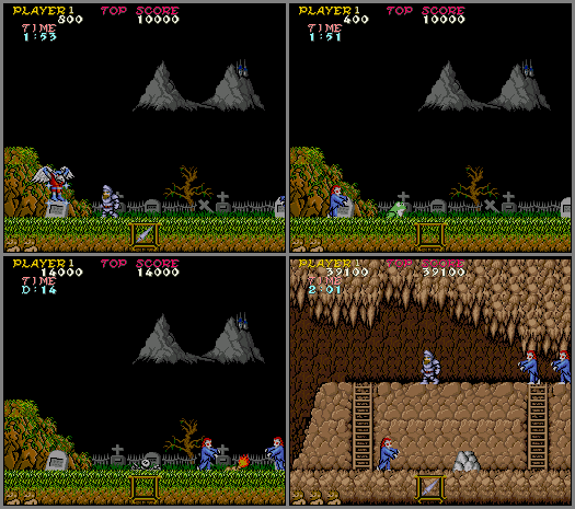 • Frog character - Shoot (you have to duck down) a tombstone 15 times. A winged creature will appear and fire a bolt at you (picture #2), changing you into a frog (picture #3). If you can shoot the creature before it disappears, it’s worth 2k points. You will automatically change back after a few seconds. You can also avoid being hit by the bolt if you jump over it from atop a tombstone.