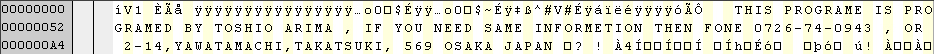 • HIDDEN MESSAGE: “THIS PROGRAME IS PROGRAMED BY TOSHIO ARIMA , IF YOU NEED SAME INFORMETION THEN FONE 0726-74-0943 , OR 2-14,YAWATAMACHI,TAKATSUKI, 569 OSAKA JAPAN” can be found at the beginning of the compiled code listing for rom "gg2.bin" (picture #1).