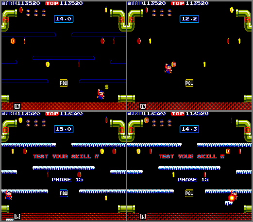 • BUG: Phase 15 (bonus coin) – When Mario starts jumping on the bottom level, a section of platform sometimes appears next to him (pictures #3 and 4). The same thing happens with the next coin round (phase 22), and possibly every (?) coin round after that.