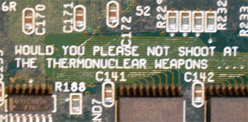 • HIDDEN MESSAGE: The message “WOULD YOU PLEASE NOT SHOOT AT THE THERMONUCLEAR WEAPONS….” on the main pcb (see photo).