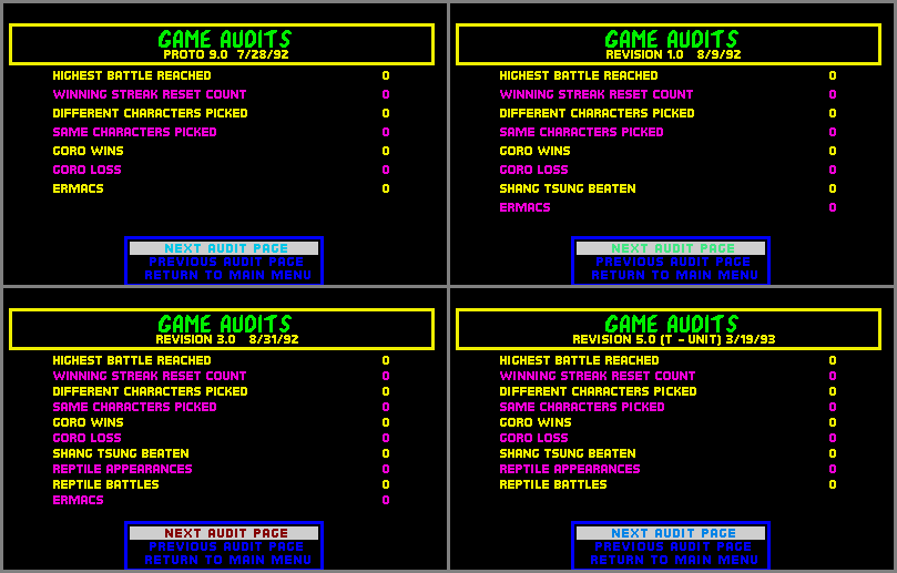 • Game Audit screen – not all versions tracked the same information on the audit screen . The prototype version (picture #1) doesn’t track Shang Tsung or Reptile. Versions 1 and 2 (picture #2) doesn’t track Reptile. Versions 3 and 4 (picture #3) track everything. Version 5 (picture #4) doesn’t track ERMACs.