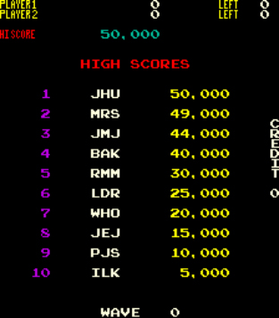• In MAME, there’s music that plays during the game, but it stops at the start of wave 14. The arcade machine doesn’t play music, although there’s a chip on the pcb for it, and it’s possible to enable it!