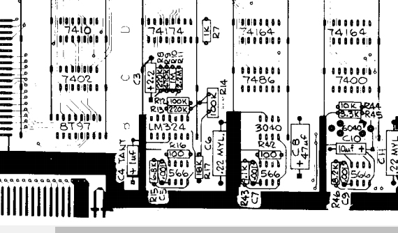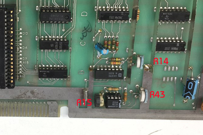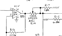 • There's 4 pots on the board, but the (rev 1) manual only describes the purpose of R111 - volume. R11 also seems to be involved with the digital speed info (pg. 28 of manual). R14 is shown having a 100k pot in the schematic (picture #1) and is labeled as a speed adjustment (in regards to the top speed?). R14, R15, and R43 are shown in the board layout as having resistors (picture #2), but the board has pots in those locations (picture #3). The resistor to the right of the 8-pin IC at A5 is listed as being 10K in the schematics but it looks like 15K from the photo. The schematic also shows 3 of those same ICs (A5, A6, and A7), but the board doesn't show one at A6.
