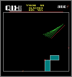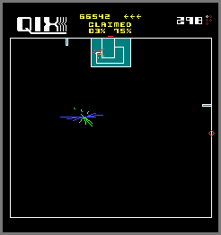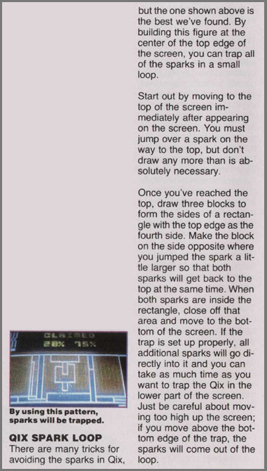 • Sparx loop trap - At the start, go to the top of the screen (you’ll have to draw a box to get around a Sparx). Make a box of equal size off center at the top (if you came up the right side, make it on the left; if you came up the left, make it on the right). This will adjust the timing of the Sparx so that both meet up at the same time. Now start drawing the trap (picture #2). Draw the first box in the middle of the top border (from left-to-right) so that any additional Sparx will first appear inside it). Next, draw the 2nd “cap” box, starting and ending on the sides of the box you just made (from right-to-left). By now the Sparx should be there. Finally, start drawing the “cover” box (from left-to-right) as they approach and finish as they meet up in the center of the cap piece, and then immediately move down to the bottom of the cover box and wait for a few seconds. Either 1 or both Sparx should now be trapped inside the cover box (if one slips the trap, chances are it’ll be the one moving clock-wise). Any Sparx added to the playfield will enter the trap (note that if any appear when you are on or near the top border, they won’t be trapped so keep an eye on the red Sparx timer). You can draw another trap to contain any Sparx you missed the first time (either on top of, or next to the first one) but you can’t trap them once they turn blue! Variations of this trap exist; such as the pattern described and shown in the October and November 1983 issues of Joystik (picture #3).