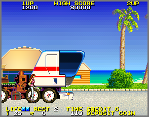 • BUG: When the game first starts, a tanker truck will go by. If you stop and watch it go by, a few seconds later it will come up behind you and stop (see picture)! {Scott Stilphen}