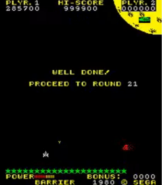 • There's 3 different screens. On the odd-numbered rounds, you get all 3. The first screen shows 6 enemies and a ringed planted that moves diagonally down from the upper-right corner. Every time you shoot one of the enemies, the planet turns into a walker. If you shoot the walker before it turns back into a planet, it’s worth 100 points. Once you shoot all 6 enemies, you get the message “PROCEED TO ENEMY BASE!” and you’ll see a warp sequence to the next screen where you again face 6 enemies, only this time they appear one after the other in a zig-zag pattern. If you shoot all 6 or you’re killed, you’ll start again on the 3rd screen. Now there’s 16 enemies and a large planet in the upper-right corner with a saucer inside it. If you repeatedly shoot the planet underneath the saucer, it will escape to fly around and shoot at you. Once you shoot all the enemies, you’ll start again on the next round. On even-numbered rounds, you won’t see the first screen or the warp sequence. Once you reach round 21, this screen pattern will continue to alternate, even though the round number stops at 21.