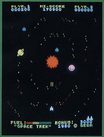 • 2 versions exist. The version in MAME and in most (all) upright and table cabinets shows “BARRIER” in the lower-left corner of the screen. However, the flyer for the game shows “SPACE TREK” instead, and features a screen not seen in the game (picture #1).