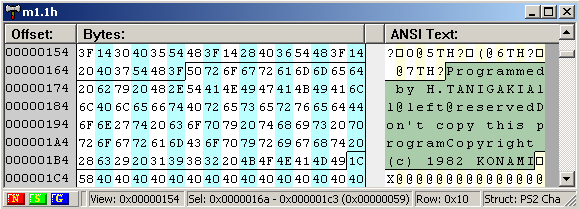 • HIDDEN MESSAGE: The message “Programmed by H.TANIGAKI All left reserved Don't copy this program Copyright (c) 1982 KONAMI” can be found in the compiled code listing for ROM M1.1H (picture #1).