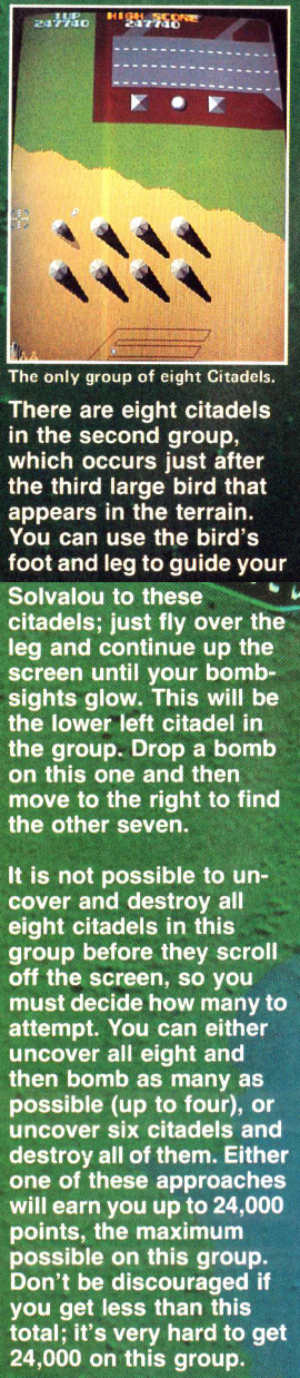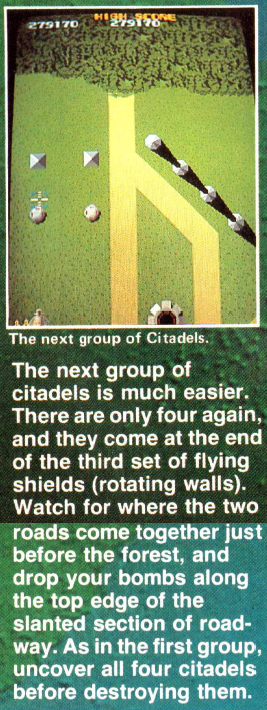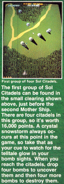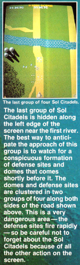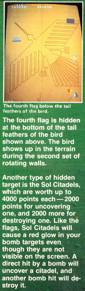 • Sol Citadels: All but 1 of the 16 areas have hidden Sol Citadels, for a total of 44; only the 14th area doesn't. The detailed map shows the location of the citadels. The targeting crosshairs will glow red when you are over one. Bombing them uncovers them and nets you 2,000 points. Bombing them again earns you another 2,000 points. Most of them are isolated, but there are 3 groups of 2 citadels, 3 groups of 4 citadels, and 1 group of 8 citadels. Unlike the flags, these structures are always in the same place. The October 1983 issue of Joystik explains how to find the groups of 4 and 8 in more detail (pictures #9 - #12). It's believed that it's not possible to uncover and destroy the entire group of 8 citadels.