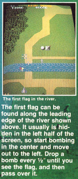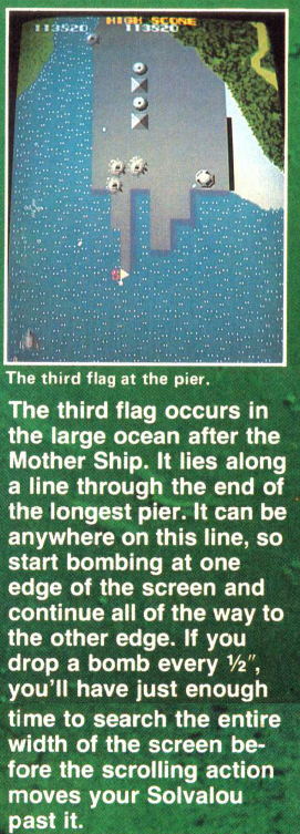 • Hidden flags: There are 4 hidden flags in the game, hidden in areas 1, 3, 5, and 7. Flying over a flag awards you a free Solvalou. The detailed map shows the location of the flags. The October 1983 issue of Joystik explains how to find them in more detail (pictures #5 - #8).
