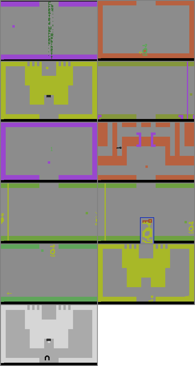 • BUG: There is a room in the maze of the White castle that has what appears to be an entrance/exit at the bottom of the screen, but you can’t go through it (picture #6). The passage was originally intended to lead to the upper part of the white castle (i.e. the "balcony"). Warren Robinett decided not to use this idea, but the wall graphics were not corrected. From Warren: "One of these exits is the normal one through the door of the castle, but the other exit, from the hard-to-get-to room in Section 2, leads to the 'balcony' of the White Castle. The link from the Red Maze to the balcony is one-way, however; it is not possible to go back into the Red Maze from the balcony. This violates my principle of making all paths retraceable, and was a mistake--an earlier idea that was rejected but never expunged".