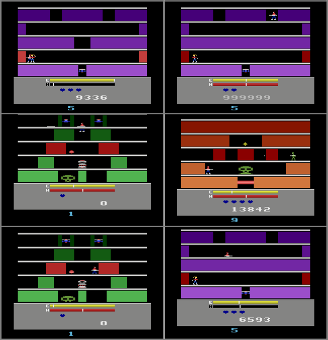 • There is some randomness in the game. The small, shooting helicopter-type enemy first seen on level 2 will either appear close to the ground or centered between 2 platforms. There's apparently no way to affect its appearance. Which floor on a given screen appears as a dangerous (flashing) type is also random.