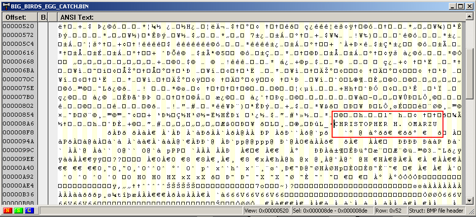 • HIDDEN MESSAGE: “CHRISTOPHER H. OMARZU“ and “C.H. OMARZU” (the programmer’s name) can be found in the compiled code listing (picture #1). {Scott Stilphen}