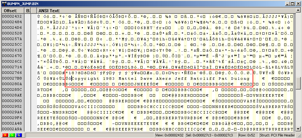 • HIDDEN MESSAGE: “Copyright 1983 Mattel Dave Akers Jeff Ratcliff Pat Dulong” can be found in the compiled code listing (picture #1). {Scott Stilphen}