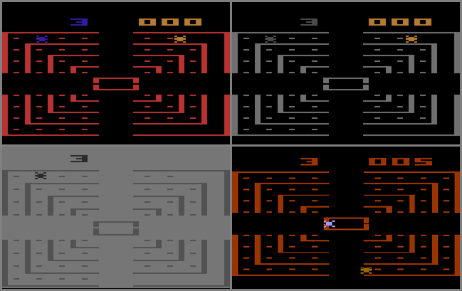 • BUG: Hit SELECT as the last dot is cleared. The computer car will then drive straight up the screen and the game resets (picture #4)! {Scott Stilphen}