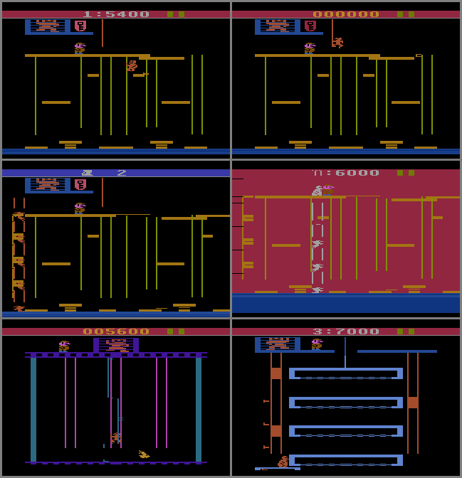 • BUG: On the 3rd screen, walk to the end of the platform you start on, and press the FIRE button. Junior will jump twice and the game will crash. Pressing either FIRE or RESET may bring it back, but the game will have some major glitches on all the screens (rolling screen, distorted graphics, etc. – pictures #4-#6). You may end up with a game with unlimited lives, or a blank screen. {Jim Goebel} Also, a line will appear through the block on the right set of vines, and also on top of the lower block on the left set, depending where the Snapjaws are. {Scott Stilphen}