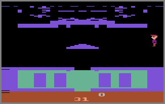 • BUG: Besides obvious glitches (no sound, bullets wrap-around at left screen edge, jump/hang in air, etc.), at the start, walk across the elevator shaft until you are about a character width to the right of the right-most door (beneath you) and push up. You will float up a little (to the “roof”) and be stuck on an invisible floor (see picture)! When riding escalators, you can walk either right or level, into the escalator graphic. If done on escalators on the left side, you can either wrap-around to the right, or walk straight down through the floors! {Scott Stilphen}