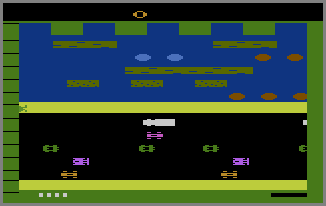• BUG: Teleporting frog - set the Difficulty switch to B (allowing you to wrap-around the screen). Begin game play and jump on a log that moves to the right, and ride off the screen. Jump left before your frog reappears and you’ll transport to the center of the screen (see video) - if this is done on the top log, you can safely transport to the other one! {Mark Androvich}