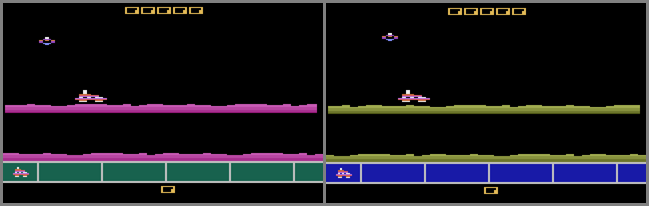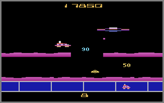 • BUG: The more time you spend on a level, the more different formations of saucers you’ll see. First 1 saucer will attack, and then 2, and then 3. A formation of 3 saucers will appear later, with the center one invisible (and at least one can wrap-around the screen). If you stay on a level for a long time, you’ll start seeing giant saucers (see picture and video)! {Scott Stilphen}