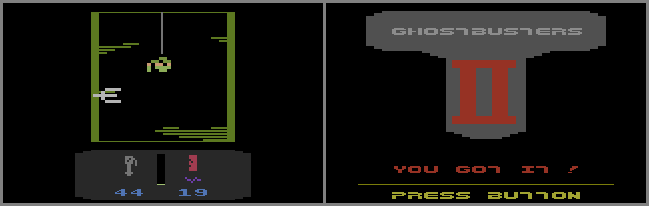 • BUG: The manual was based on the Commodore 64 version, and as a result contains several errors. It mentions using the space bar to toggle between your 3 weapons (Proton Beam, PKR Bomb, and PKR Shield), but you actually use the SELECT switch. Also, it mentions that on the 2nd part (Broadway), when a ghost is hit, it dissolves into globs of slime which stay until a new wave of ghosts appear, and The Ghostbusters will march out into the street to mop them up; the slime actually appears whether or not you hit a ghost, and you have to put the fireball over the slime (and press the FIRE button) to collect it. The manual mentions "toggling the joystick" to make The Ghostbusters move left and right, but they never appear in the 2nd part.