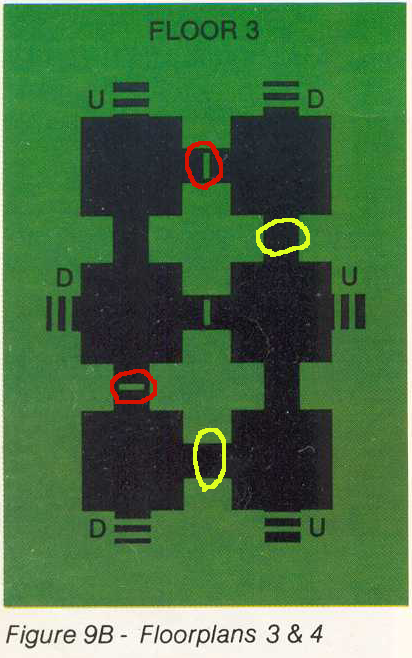 • BUG: In the manual, the map of the 3rd floor (pg. 9) is wrong. It shows 2 locked doors in the wrong locations for games #3-8 (circled in red – picture #6); they should be at the locations circled in yellow. {Scott Stilphen}