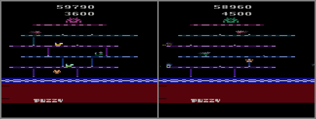 • BUG: A guard will sometimes wrap-around the screen (picture #2). This only happens on the 1st and 3rd levels where the platforms are close to the left side of the screen, and the chances of it happening increase the faster the guards get. The graphics for them will also become momentarily corrupted when they reach the left-most edge.