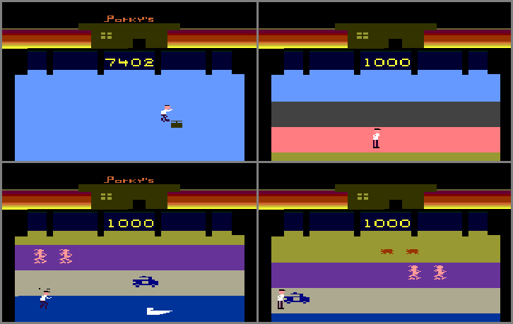 • A “perfect” game scores only 7,402 (picture #1). It can be achieved by completing the highway gauntlet the first time (w/o hitting any), and then completing the scaffolding screen (w/o getting caught by Porky). The Difficulty switch settings don’t affect this.