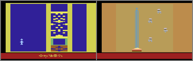• Tsetse flies - They can’t bite you if move all the way to the bottom of the screen (in either the Valley of Poison or the Spider room) so that only your hat will be visible, and avoid roughly 1/3 of the left side of the screen. This is because the swarm is made up of 4 distinct clusters, and its ‘center’ is the right cluster. When you’re in this specific position, the right cluster is centered over Indy (but since both are off-screen, there’s no collision-detection taking place) so the top cluster will continually swarm right by your hat. If you start in the right corner and slowly move towards the left, you can actually move the swarm w/o getting bit! When you’re within a step or two of your range limit, the top cluster will flicker in a pattern much like a tiny Atari Fuji symbol. There’s only a few points beyond that (in the Spider room) where you can stand and not get bit.